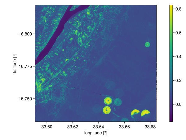 geo_ds = open_dataset("https://github.com/danlooo/DGGS.jl/raw/refs/heads/main/test/data/s2-ndvi-irrigation.tif")YAXArray Dataset